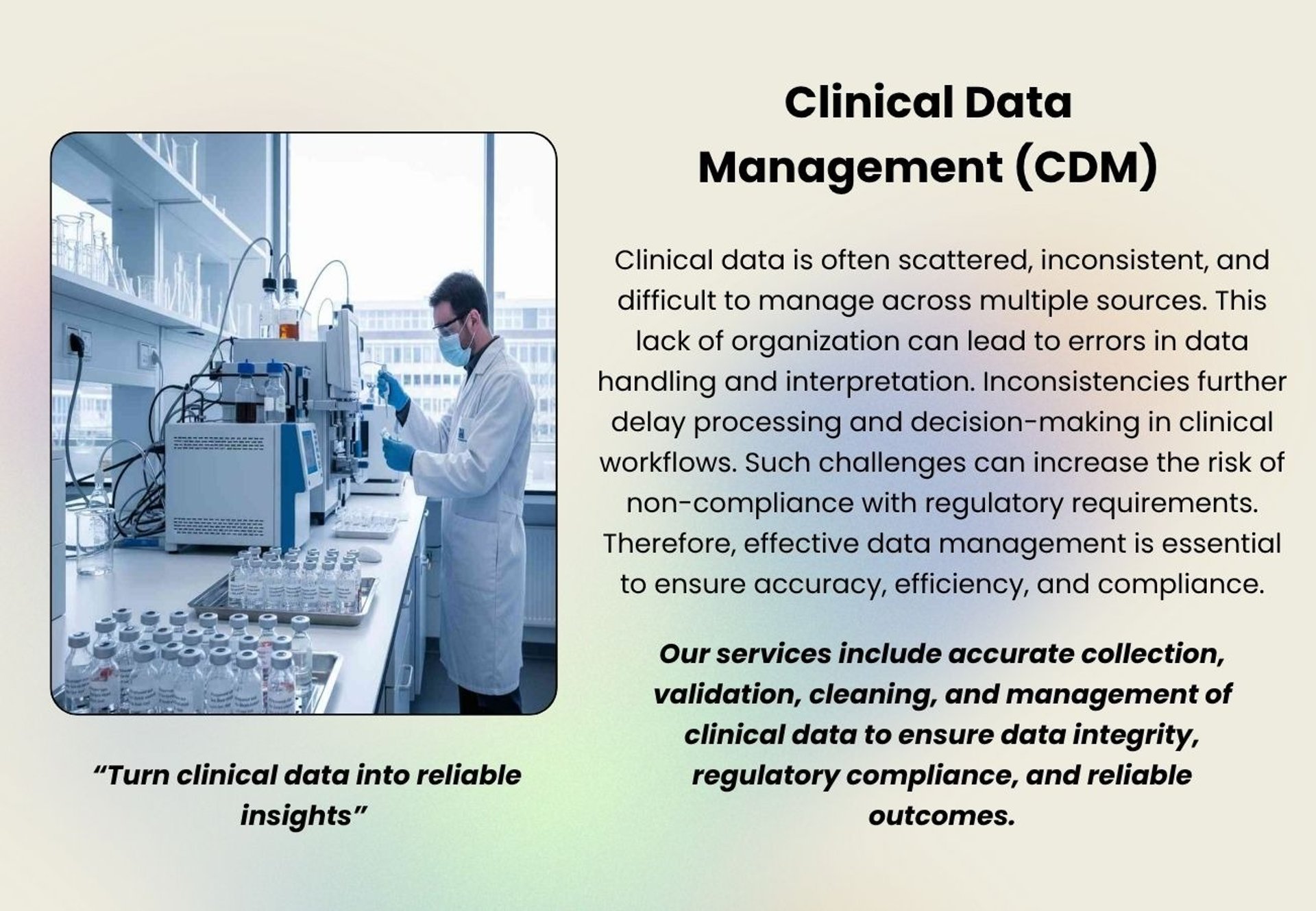 Our clinical data management services deliver accurate, consistent, and regulatory-compliant trial data. We support database design, data validation, cleaning, and reporting in alignment with ICH-GCP and global regulatory requirements, enabling confident, data-driven decision-making.