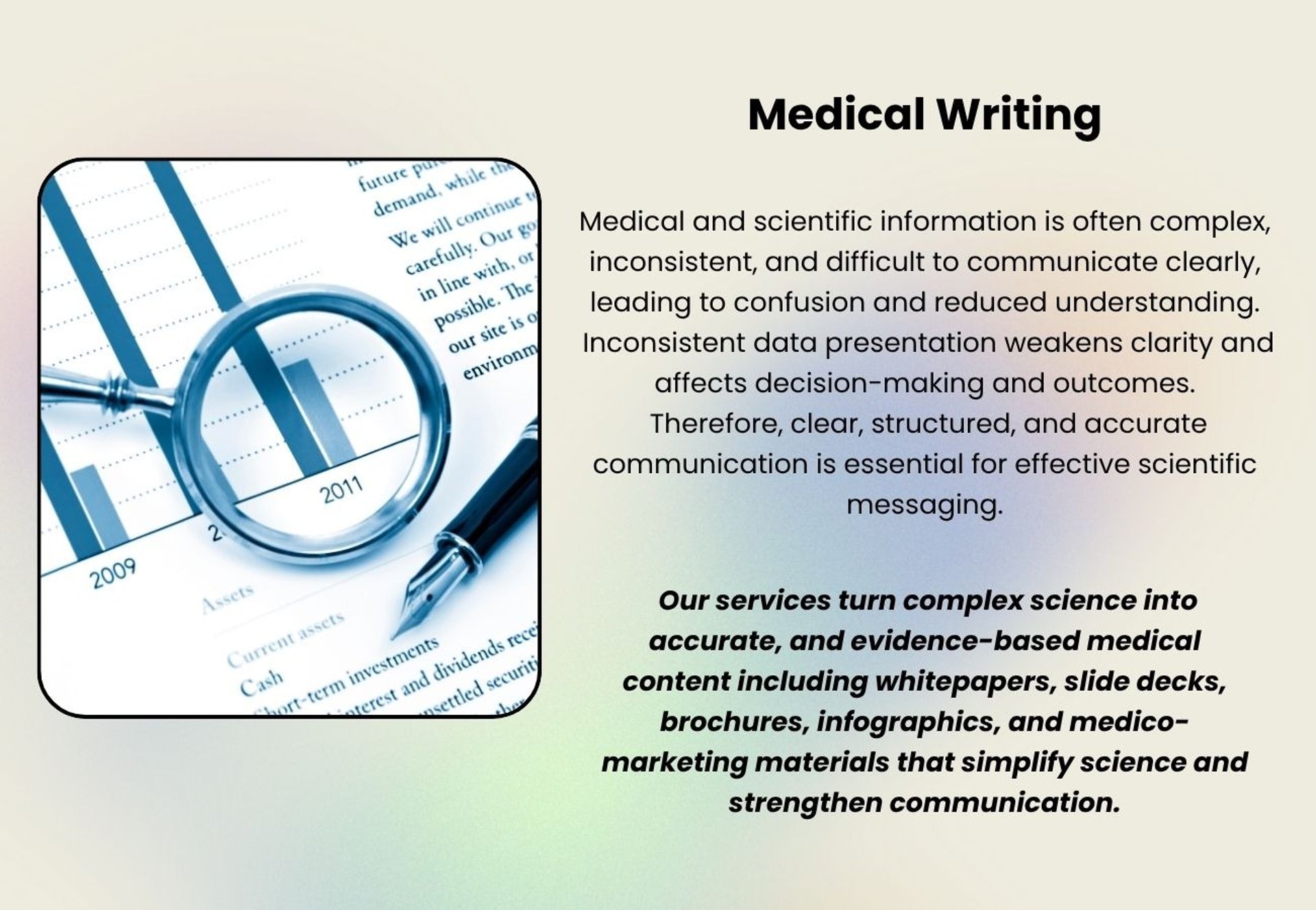 Providing expert medical writing, medical coding, medical record summarization, and clinical data management services to support accurate documentation, regulatory compliance, and informed healthcare decisions.