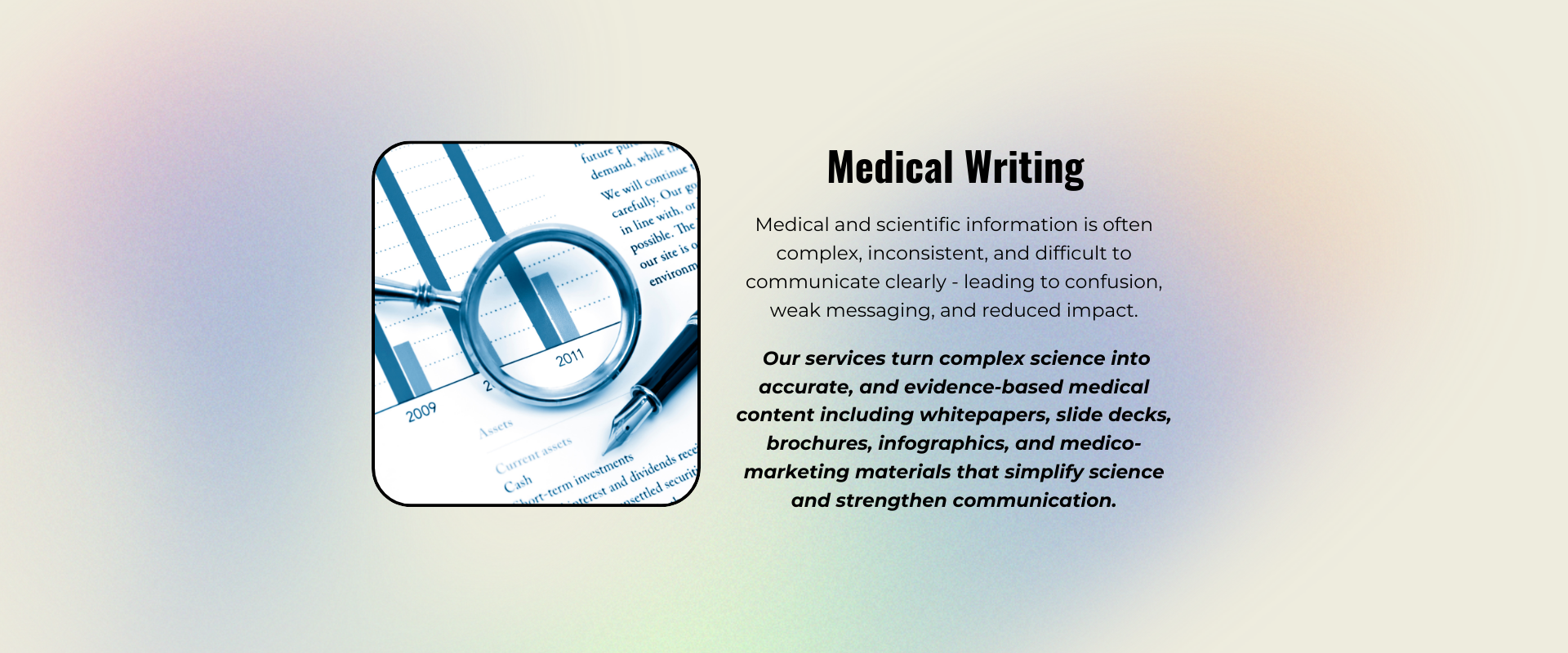 Providing expert medical writing, medical coding, medical record summarization, and clinical data management services to support accurate documentation, regulatory compliance, and informed healthcare decisions.