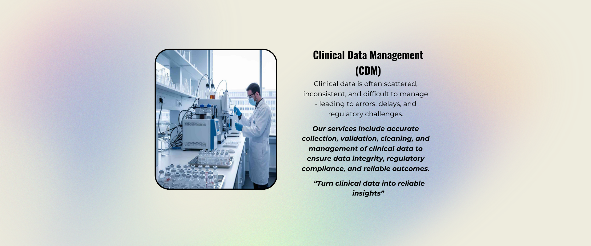 Our clinical data management services deliver accurate, consistent, and regulatory-compliant trial data. We support database design, data validation, cleaning, and reporting in alignment with ICH-GCP and global regulatory requirements, enabling confident, data-driven decision-making.